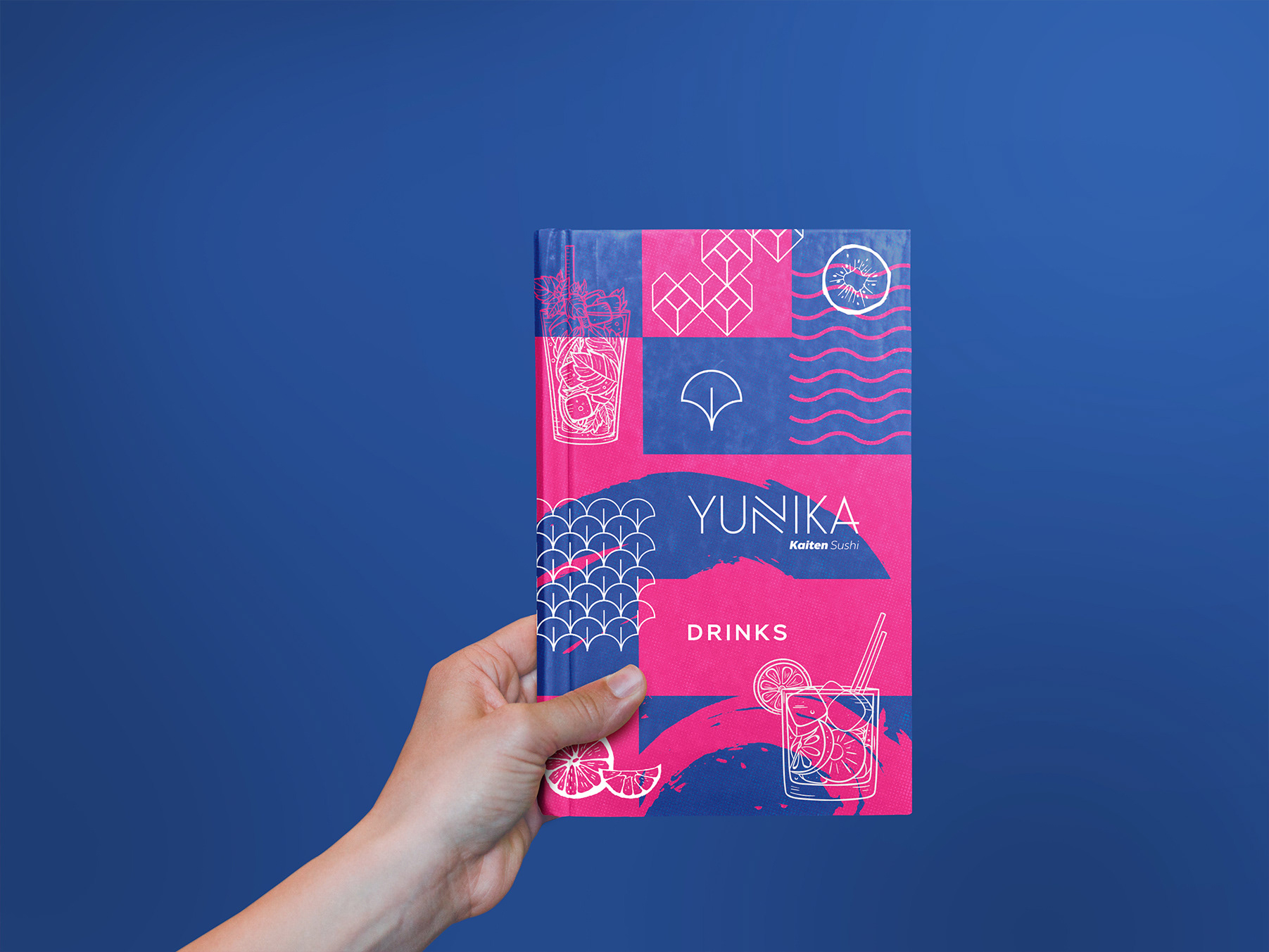 Projeto de identidade visual para cardápios e embalagem do restaurante Yunika.
